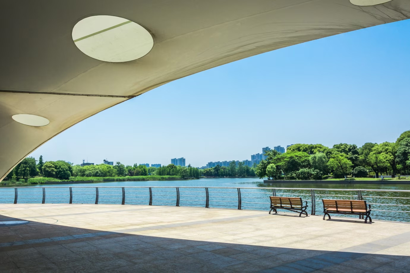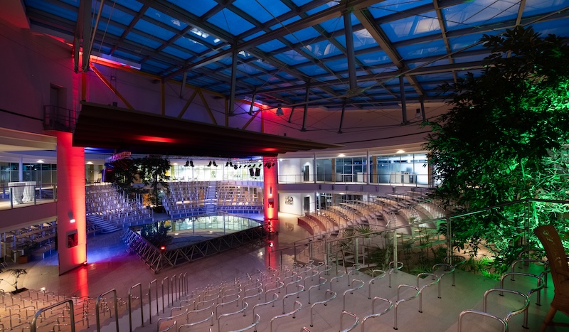 Das zentrale Atrium mit halbrunden Rängen ist der ideale Ort für Messen, Kultur oder Firmenevents.